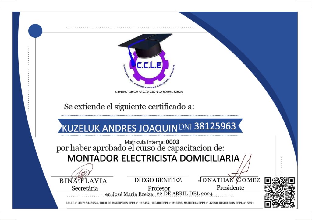 Certificado emitido por centro de capacitación laboral Ezeiza desde 2015 inscripto en DPPJ N 118452 Resolución DPPJ N 5991 MATRÍCULA DPPJ N 42950.